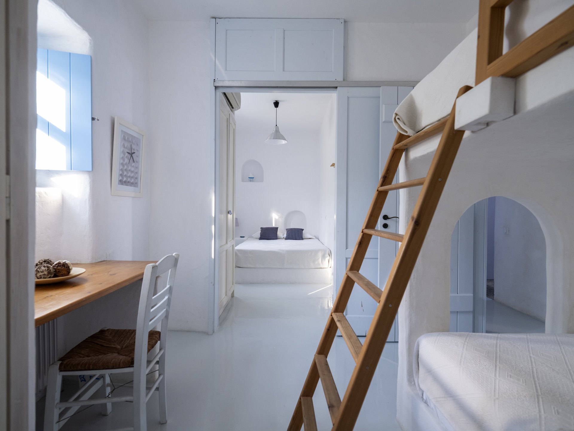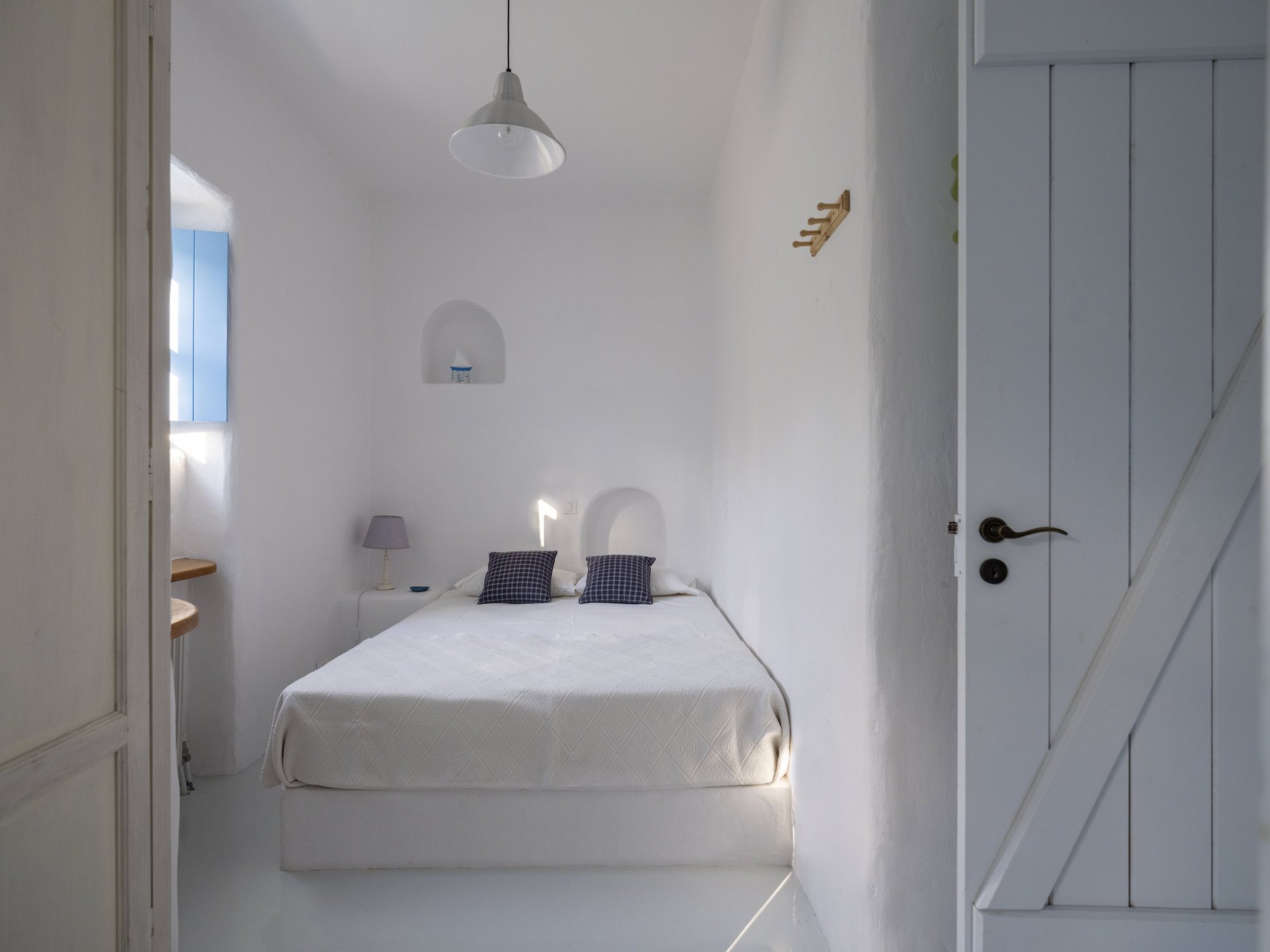 Stepping inside, the villa’s white-washed interiors provide a clean and calming ambiance. On the ground floor, you will find a bright living room, a dining area, and an open-plan, fully equipped kitchen. Also, this level hosts two bedrooms sharing a bathroom. Moreover, there is a double bedroom with an en-suite bathroom and beautiful sea views.