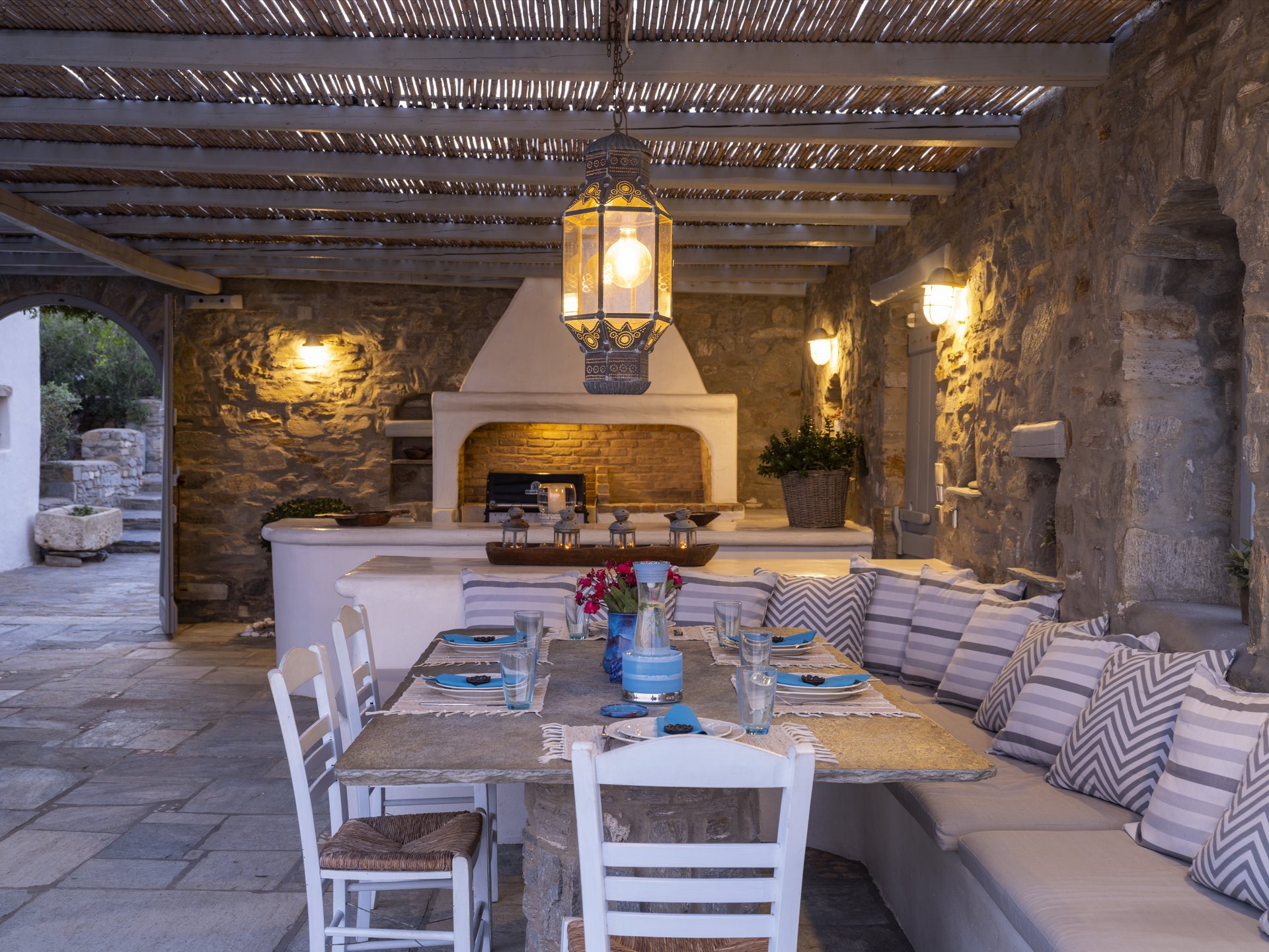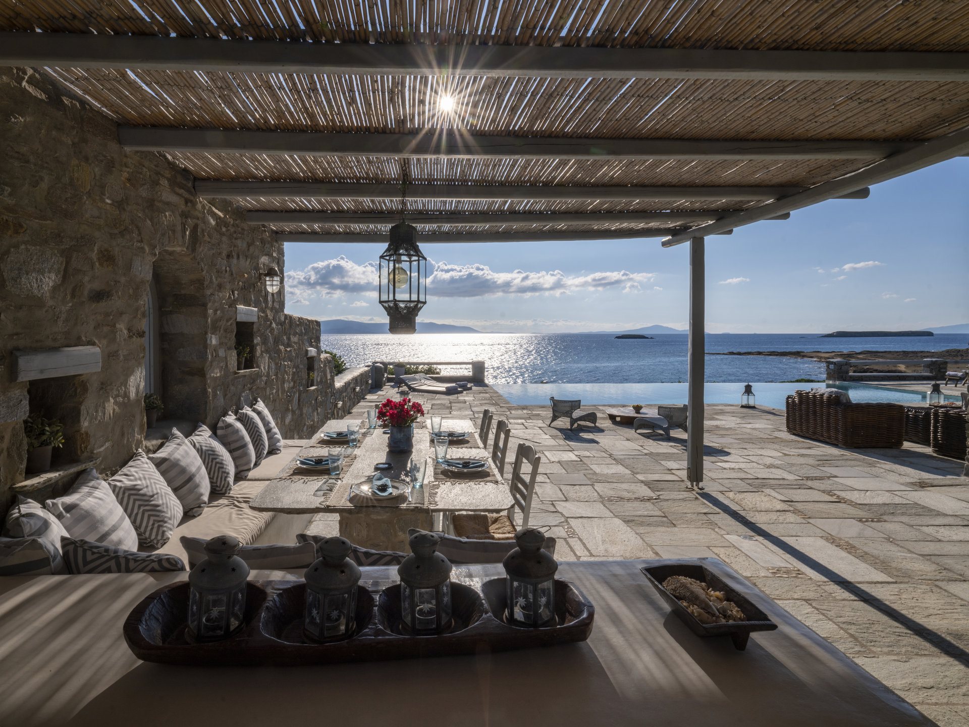 Built with a harmonious blend of stone, marble, and wood, Villa Anatolia in Paros creates an authentic yet stylish atmosphere. This villa for rent in Paros offers everything you may need for a memorable stay. Surrounded by a spacious terrace, it features a private swimming pool and uninterrupted views of the endless Aegean Sea. Additionally, the outdoor spaces offer cozy lounge settings, two large pergolas, and a BBQ area for unforgettable summer moments.