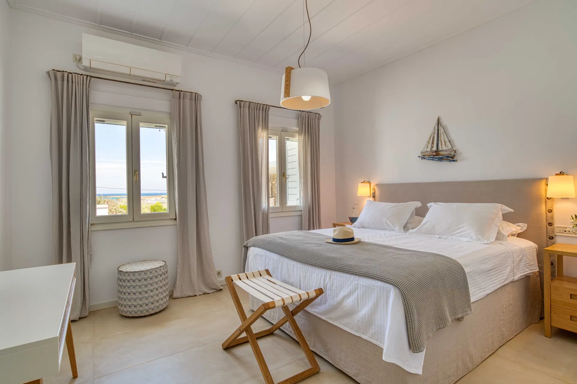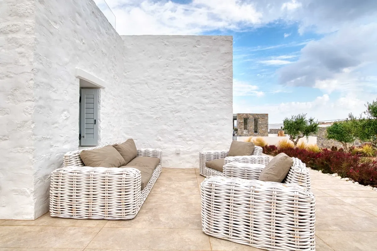 Outdoors, Villa Estelle opens into thoughtfully designed spaces that invite you to slow down and enjoy the island lifestyle. A private swimming pool sits at the heart of the property, ideal for refreshing swims throughout the day, while the sea-view Jacuzzi offers a relaxing spot to unwind and take in the surroundings. The villa is framed by a well-maintained garden, creating a calm and private setting with multiple areas to sit back and enjoy the Paros sun or a quiet evening outdoors.