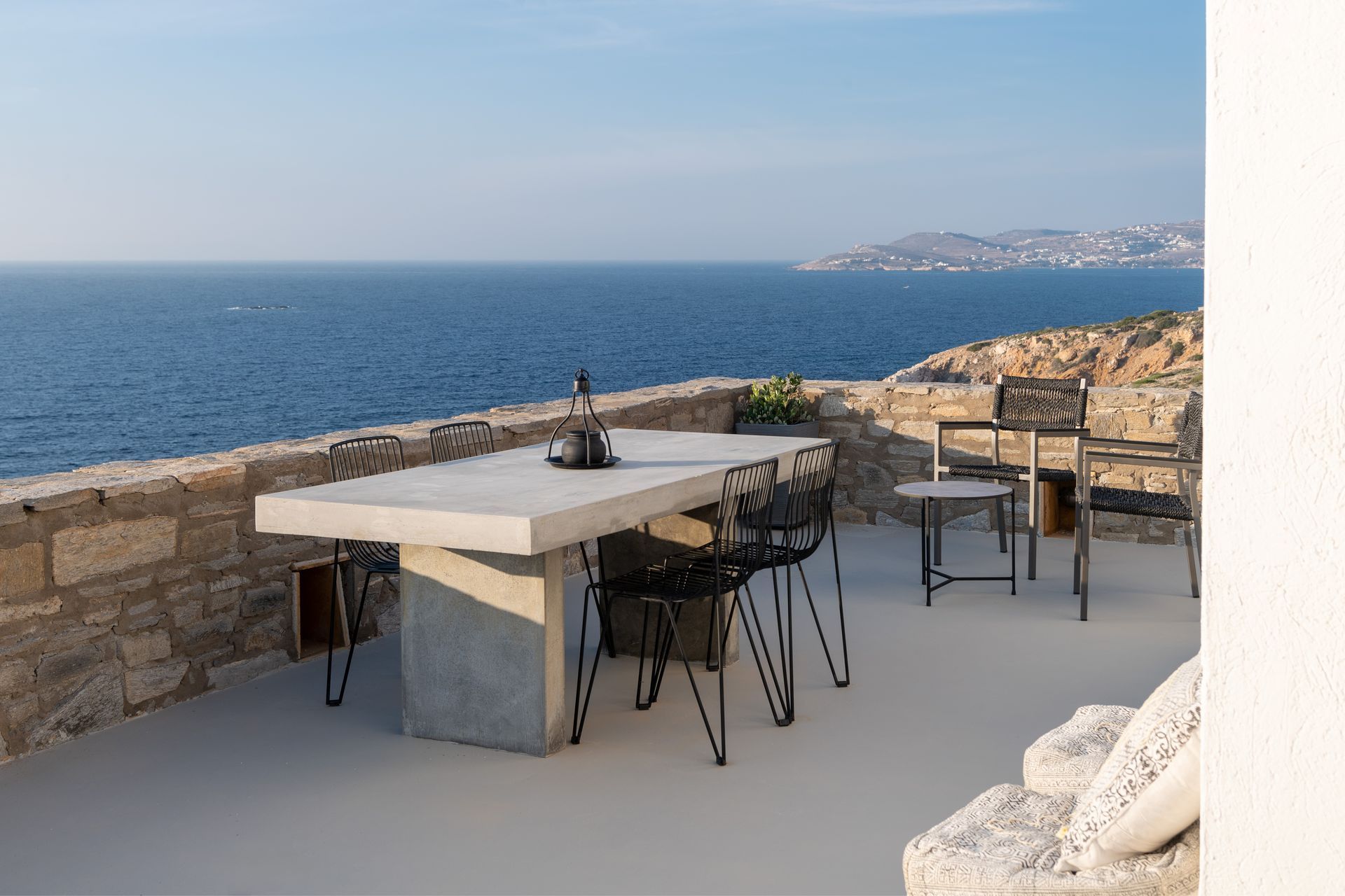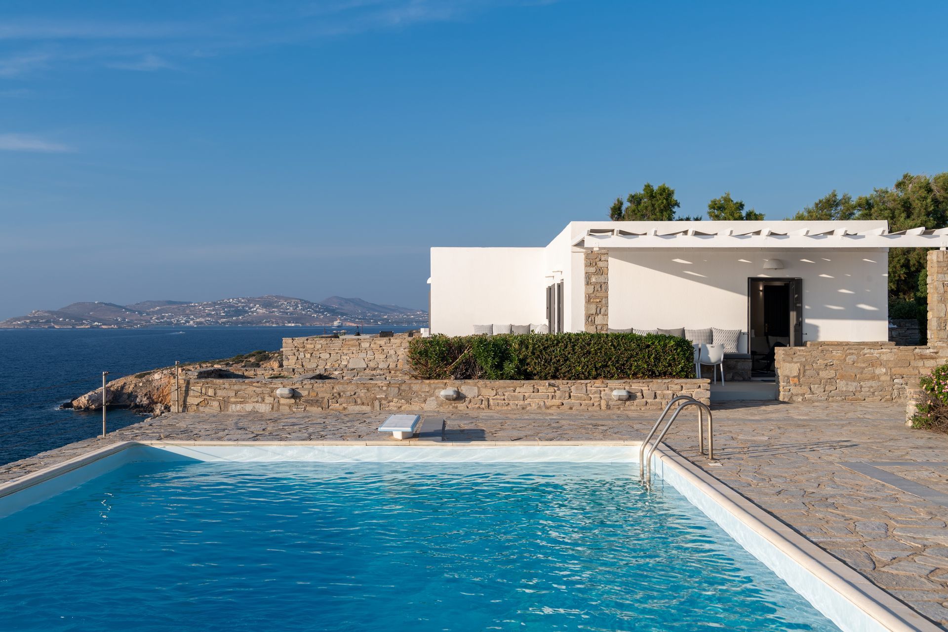 The villa’s expansive shared swimming pool area offers a serene retreat with stunning views of the Aegean Sea, perfect for relaxing under the sun or enjoying the vibrant colors of the sunset. Surrounding the pool, lovely terraces feature both dining and lounge areas, inviting guests to indulge in alfresco meals or unwind in comfort while enjoying the breathtaking ocean view.