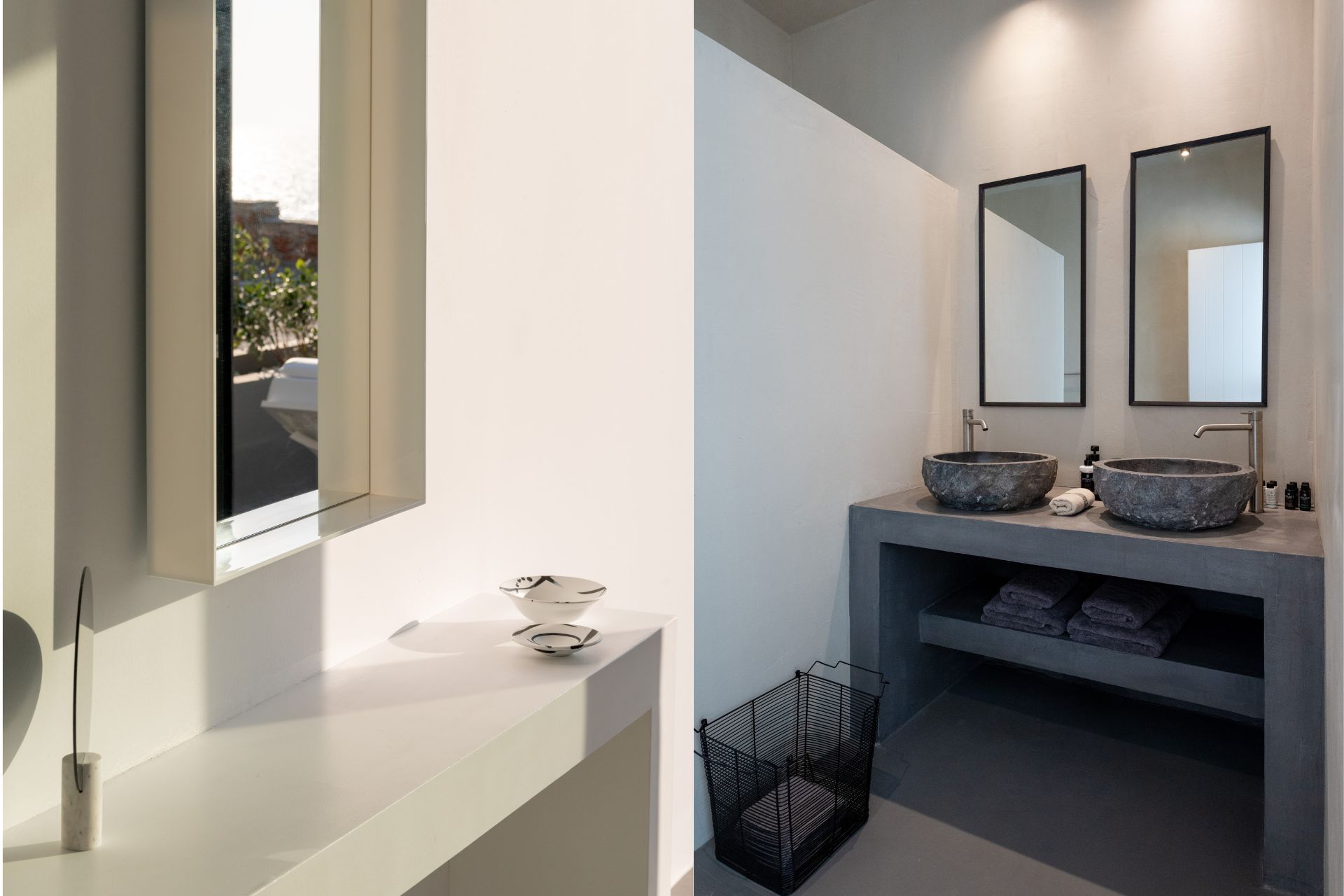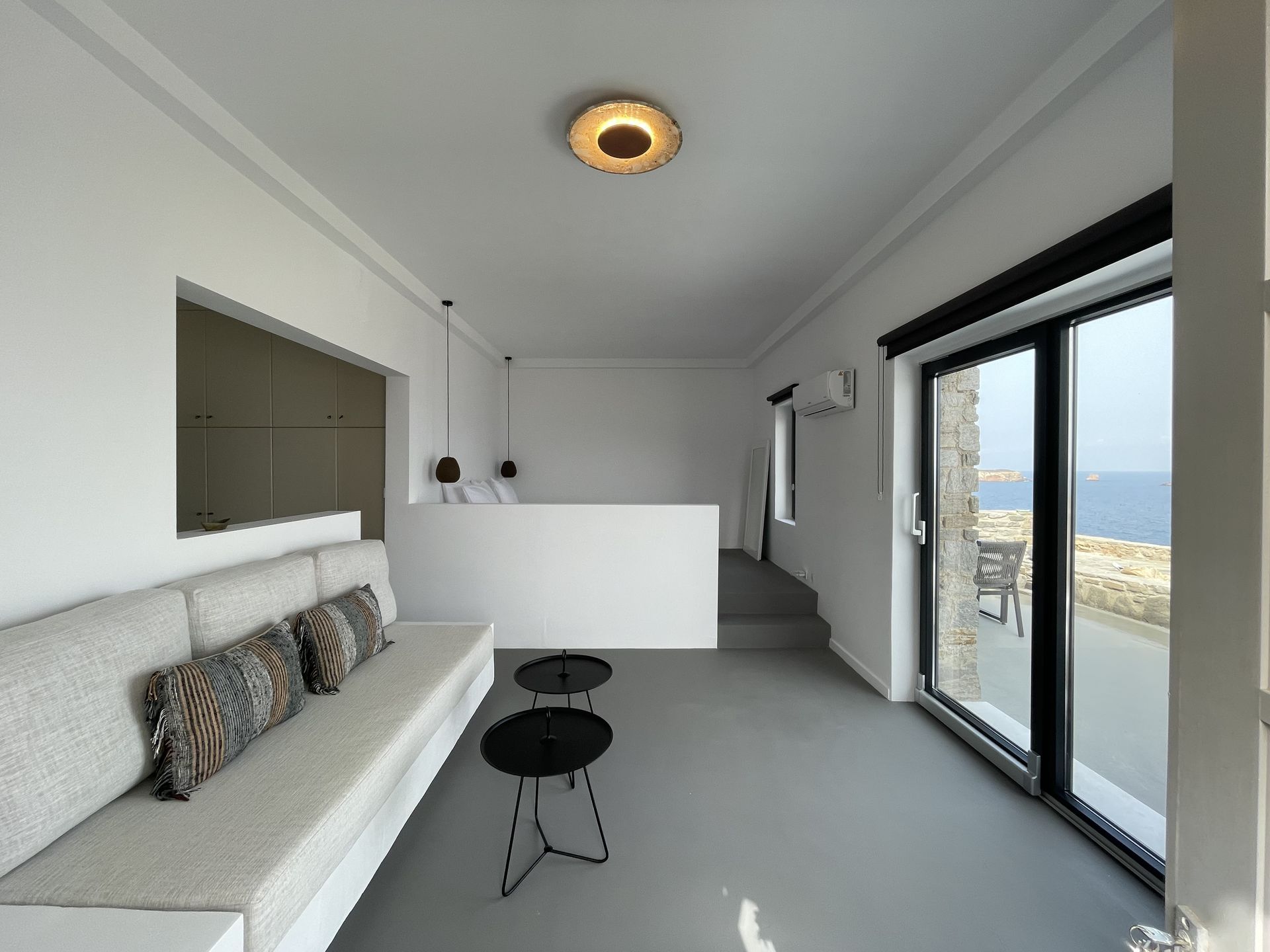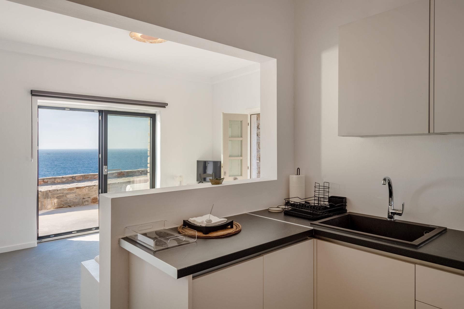 The entrance level of Villa Nautica in Paros features a spacious open-plan living area, seamlessly connecting the lounge, dining, and fully equipped kitchen. This level also includes a double bedroom with a private veranda offering panoramic sea views and a second bedroom that can be configured as a twin or double, based on preference. The large terraces surrounding the living room provide ample space for outdoor dining and relaxation, all with stunning views of the Aegean. The lower level of the villa is home to a unique cave residence where Cycladic tradition meets modern innovation. The minimalist design features two bedrooms, a fully equipped kitchen with a white marble countertop, and an elegant living room. Large windows connect the space to the outdoors, flooding the interior with natural light and allowing guests to embrace the island’s beauty. Adjacent to the cave residence, an independent bedroom offers additional privacy and comfort, ideal for 2-3 people.